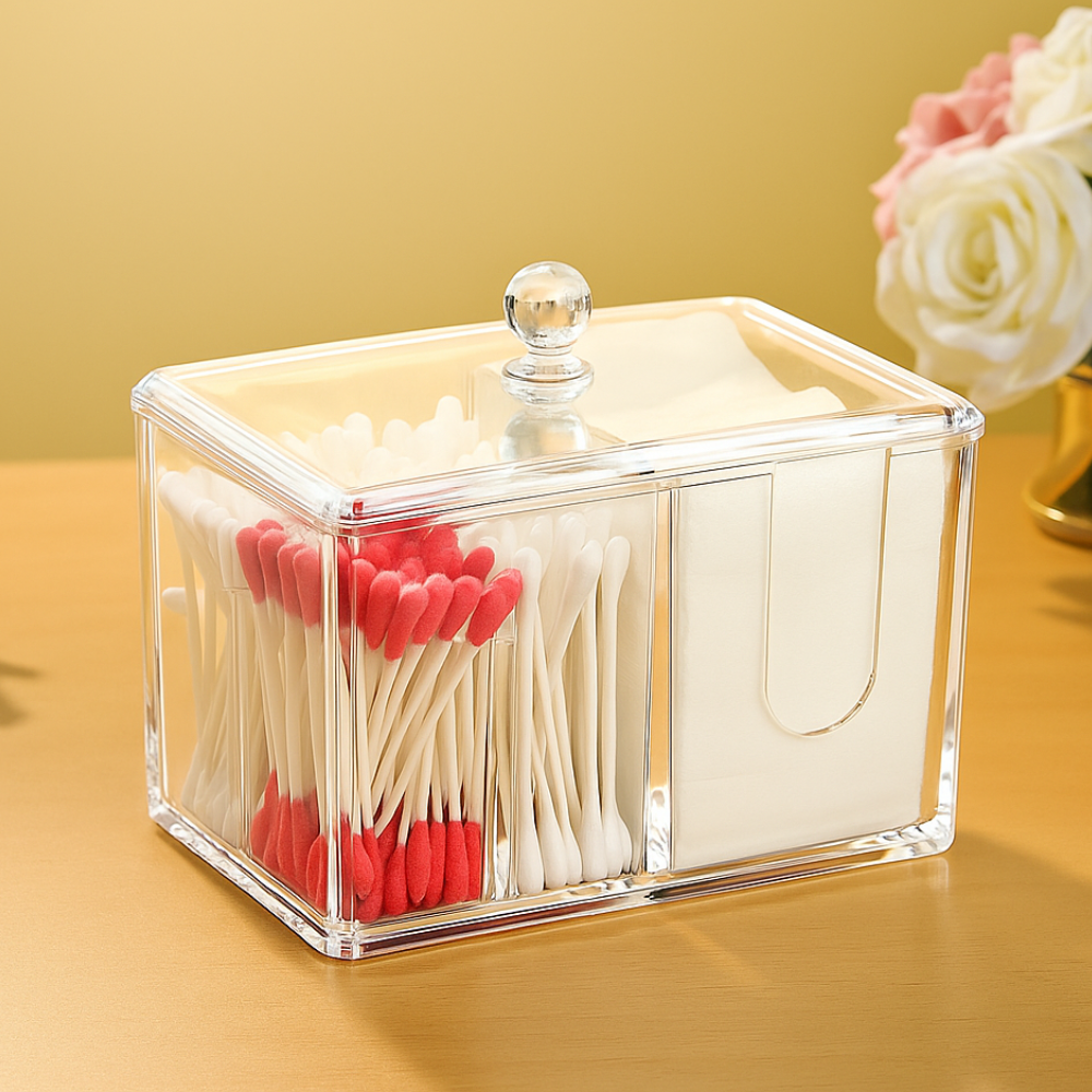 Organização inteligente: Possui 4 compartimentos que permitem separar algodão, cotonetes e outros acessórios de cuidado pessoal. Isso facilita o acesso e mantém cada item no seu devido lugar, evitando bagunça.